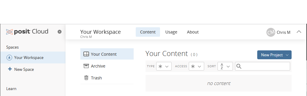 After creating your account, you will be redirected to the Posit Cloud home page. If you are not, just go to https://posit.cloud/ and make sure you are signed in.